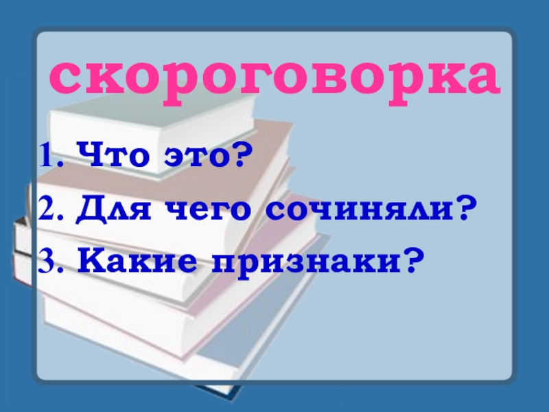 2. Шуточный жанр народного творчества – фраза, построенная на сочетании звуков, которые затрудняют быстрое произнесение слов.