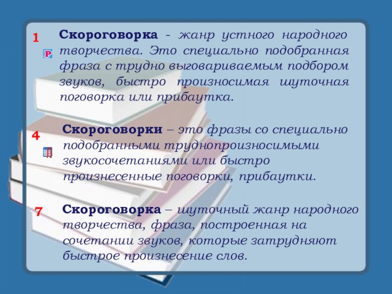Скороговорка – шуточный жанр народного творчества, фраза, построенная на сочетании звуков, которые затрудняют быстрое произнесение слов.