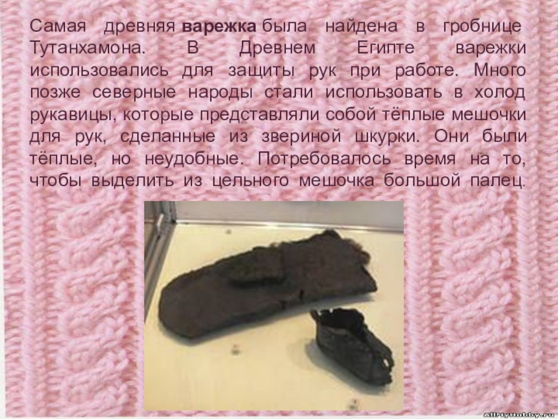 Слайд 6Самая древняя варежка была найдена в гробнице Тутанхамона. В Древнем Египте варежки использовались