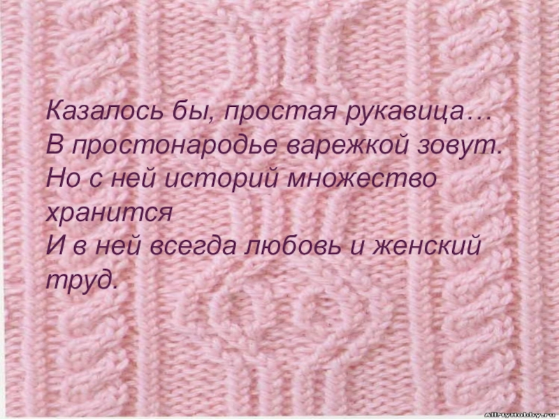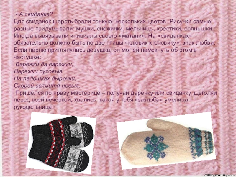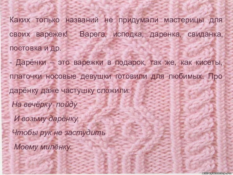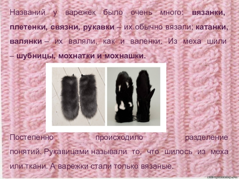 Слайд 8Названий у варежек было очень много: вязанки, плетенки, связни, рукавки – их