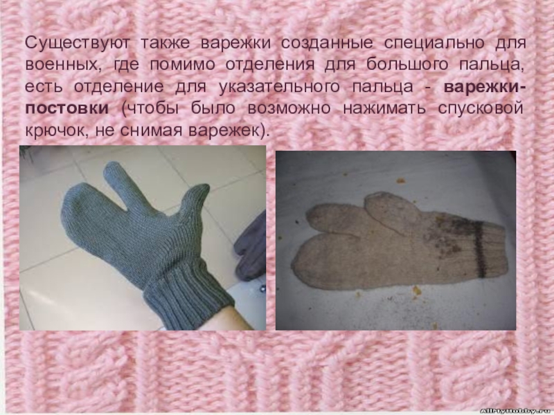 Слайд 12Существуют также варежки созданные специально для военных, где помимо отделения для
