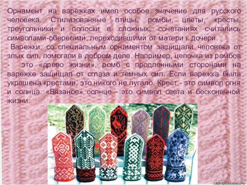 Варежки, со специальным орнаментом защищали человека от злых сил, помогали в добром деле. Например, цепочка из ромбов - это «древо жизни», ромб с продленными сторонами на варежке защищал от сглаза и темных сил. Если варежка была украшена крестами, это никого не пугало. Крест - это символ огня и солнца. «Вязаное» солнце - это символ света и бесконечной жизни.