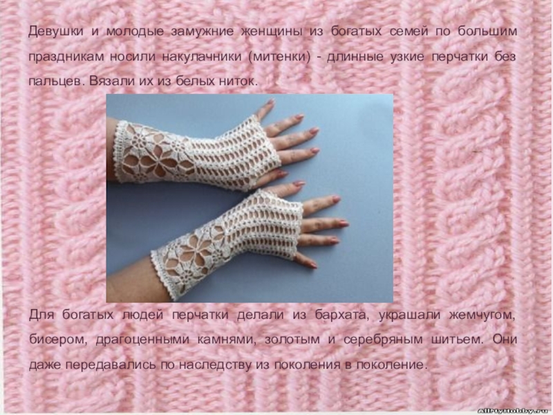 носили накулачники (митенки) - длинные узкие перчатки без пальцев. Вязали их из белых ниток.