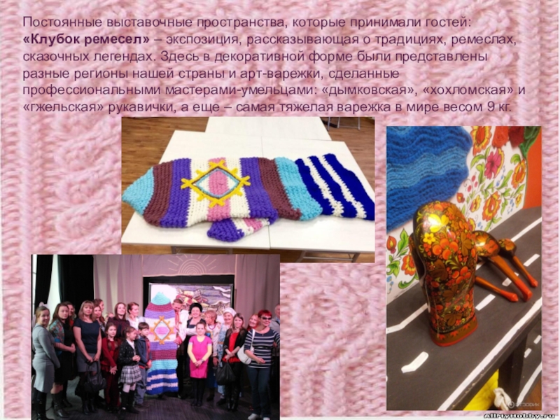 традициях, ремеслах, сказочных легендах. Здесь в декоративной форме были представлены разные регионы нашей страны и арт-варежки, сделанные профессиональными мастерами-умельцами: «дымковская», «хохломская» и «гжельская» рукавички, а еще – самая тяжелая варежка в мире весом 9 кг.