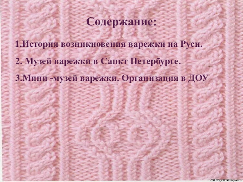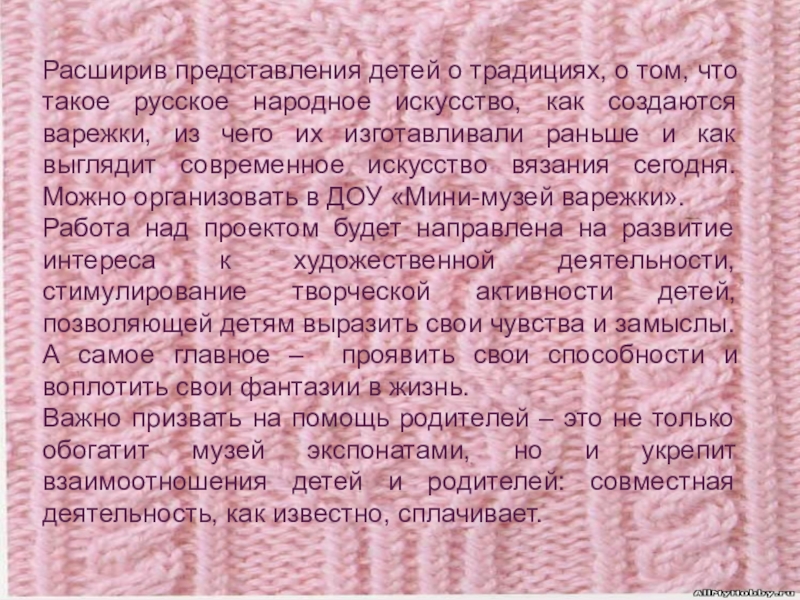 искусство, как создаются варежки, из чего их изготавливали раньше и как выглядит современное искусство вязания сегодня. Можно организовать в ДОУ «Мини-музей варежки».