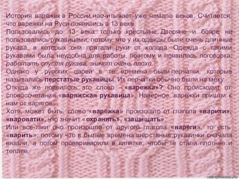 Слайд 7История варежек в России насчитывает уже немало веков. Считается, что варежки на Руси