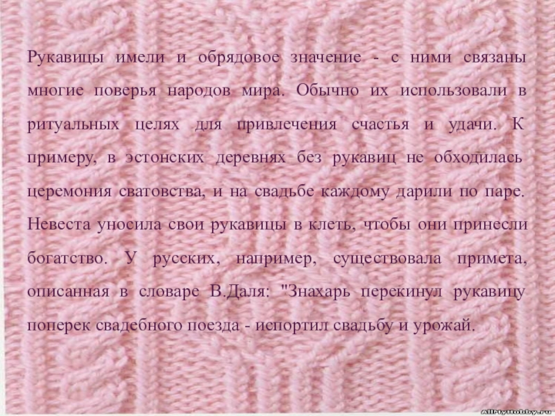 народов мира. Обычно их использовали в ритуальных целях для привлечения счастья и удачи. К примеру, в эстонских деревнях без рукавиц не обходилась церемония сватовства, и на свадьбе каждому дарили по паре. Невеста уносила свои рукавицы в клеть, чтобы они принесли богатство. У русских, например, существовала примета, описанная в словаре В.Даля: "Знахарь перекинул рукавицу поперек свадебного поезда - испортил свадьбу и урожай.