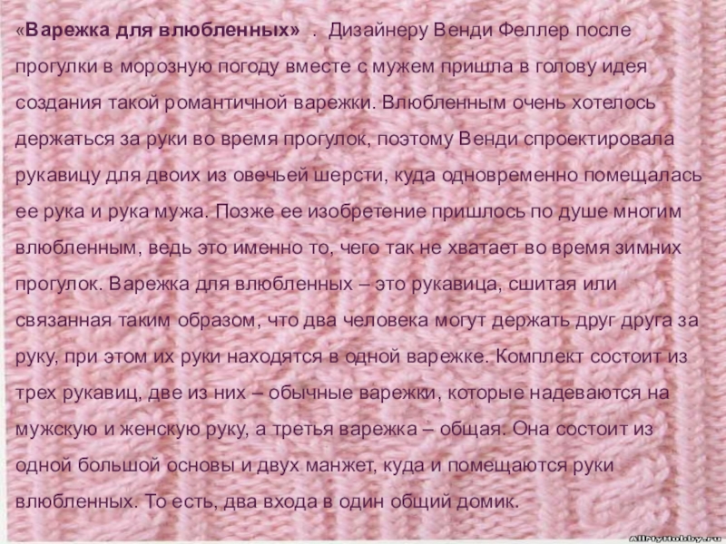 Слайд 17«Варежка для влюбленных» . Дизайнеру Венди Феллер после прогулки в морозную