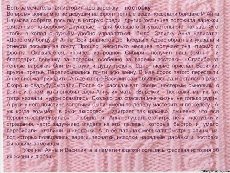 И Анна Наумова собрала посылку, в которую среди других гостинцев положила варежки связанные по-особому, двупалые – для большого и указательного пальца. Это чтобы в холод с ружьём удобно управляться было. Записку Анна написала: «Дорогому бойцу от Анны. Бей фашистов до Победы!» Адрес обратный указала и отнесла посылку на почту. Прошло несколько месяцев, получает она письмо с фронта. Оказывается, «привет из родной Сибири» получил наш земляк и благодарит девушку за подарки, особенно за варежки-постовки. «Спасибо за тёплые варежки. Они мне руки и душу греют». Одно письмо прислал Василий, другое, третье. Переписывались почти всю войну. В мае сорок пятого перестали Анне письма приходить. А в сентябре Василий сам объявился да и остался в селе. Скоро и свадьбу сыграли. После он рассказывал своим шестерым сыновьям о войне и о том, как полюбил свою Анну, их мать. «Варежки – постовки, мы их так тогда назвали, чудом оказались. Сколько раз спасали мне жизнь, не только руки». А руки у него поистине золотыми были: умели по дереву мастерить и по железу . А уж когда возьмёт в руки аккордеон , заиграет так красиво, душевно, что вся деревня заслушивалась. Любила и Анна слушать его игру, петь частушки и страдания, часто задумчиво глядела на его пальцы, которые быстро и умело перебирали клавиши и кнопочки. А в её пальцах мелькали быстрые спицы, из-под которых появлялись вареги, перчатки, исподки, нарядные дарёнки и постовки сыновьям-армейцам…