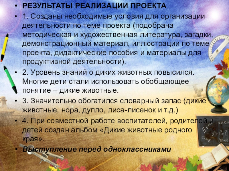 3. Значительно обогатился словарный запас (дикие животные, нора, дупло, лиса-лисенок и т.д.)