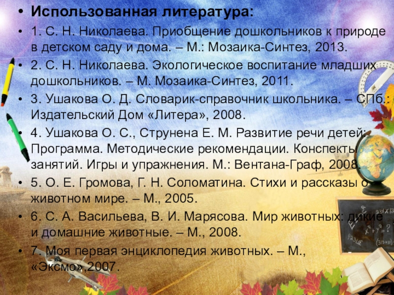 2. С. Н. Николаева. Экологическое воспитание младших дошкольников. – М. Мозаика-Синтез, 2011.