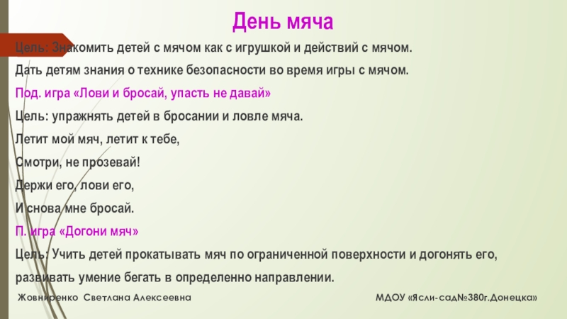 Дать детям знания о технике безопасности во время игры с мячом.