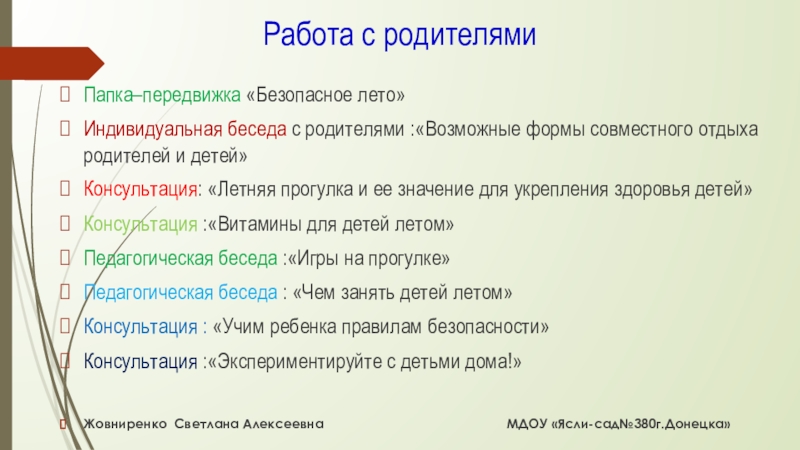 -осуществлять пед. и социальное просвещение родителей по вопросам воспитания и оздоровления детей в летний период.