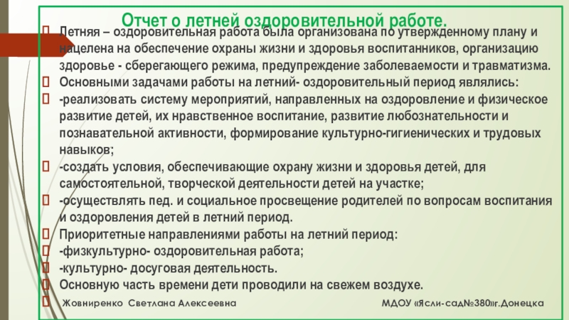 Слайд 4Отчет о летней оздоровительной работе.