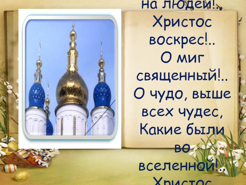 Слайд 2Сердца свободны от страстей… Так чудодейственно влияют Слова святые на людей!.. Христос воскрес!.. О миг