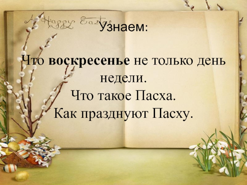 Слайд 3 Узнаем: Что воскресенье не только день недели. Что такое Пасха. Как празднуют Пасху.