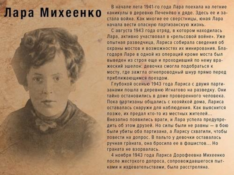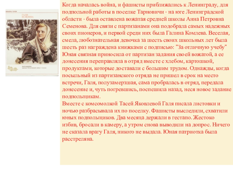 в поселке Тарновичи - на юге Ленинградской области - была оставлена вожатая средней школы Анна Петровна Семенова. Для связи с партизанами она подобрала самых надежных своих пионеров, и первой среди них была Галина Комлева. Веселая, смела, любознательная девочка за шесть своих школьных лет была шесть раз награждена книжками с подписью: "За отличную учебу" Юная связная приносила от партизан задания своей вожатой, а ее донесения переправляла в отряд вместе с хлебом, картошкой, продуктами, которые доставали с большим трудом. Однажды, когда посыльный из партизанского отряда не пришел в срок на место встречи, Галя, полузамерзшая, сама пробралась в отряд, передала донесение и, чуть погревшись, поспешила назад, неся новое задание подпольщикам. Вместе с комсомолкой Тасей Яковлевой Галя писала листовки и ночью разбрасывала их по поселку. Фашисты выследили, схватили юных подпольщиков. Два месяца держали в гестапо. Жестоко избив, бросали в камеру, а утром снова выводили на допрос. Ничего не сказала врагу Галя, никого не выдала. Юная патриотка была расстреляна.