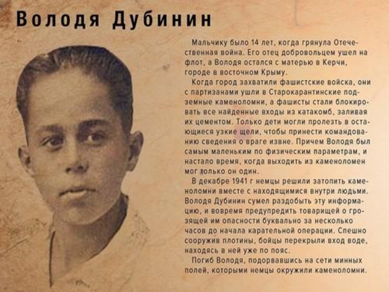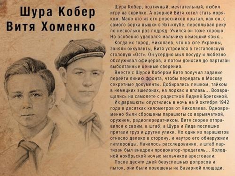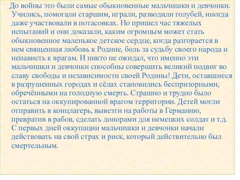 Учились, помогали старшим, играли, разводили голубей, иногда даже участвовали в потасовках. Но пришел час тяжелых испытаний и они доказали, каким огромным может стать обыкновенное маленькое детское сердце, когда разгорается в нем священная любовь к Родине, боль за судьбу своего народа и ненависть к врагам. И никто не ожидал, что именно эти мальчишки и девчонки способны совершить великий подвиг во славу свободы и независимости своей Родины! Дети, оставшиеся в разрушенных городах и сёлах становились беспризорными, обречёнными на голодную смерть. Страшно и трудно было остаться на оккупированной врагом территории. Детей могли отправить в концлагерь, вывезти на работы в Германию, превратив в рабов, сделать донорами для немецких солдат и т.д. С первых дней оккупации мальчишки и девчонки начали действовать на свой страх и риск, который действительно был смертельным.