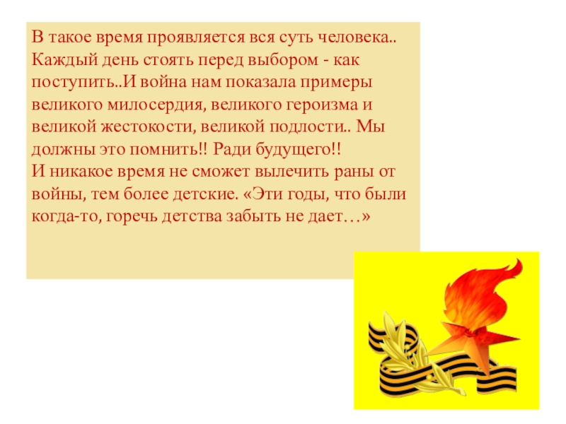 В такое время проявляется вся суть человека.. Каждый день стоять перед выбором - как поступить..И война нам