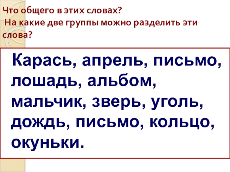 Карась, апрель, письмо, лошадь, альбом, мальчик, зверь, уголь, дождь, письмо, кольцо, окуньки.