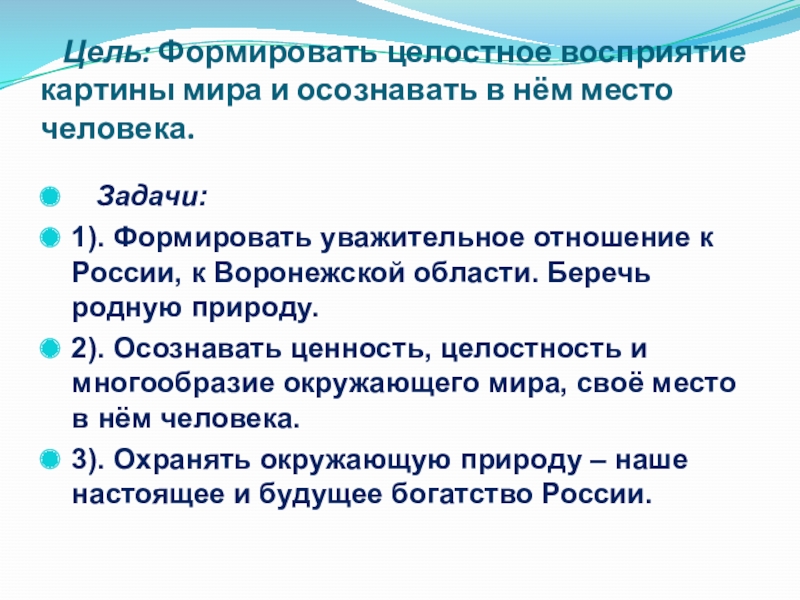1). Формировать уважительное отношение к России, к Воронежской области. Беречь родную природу.