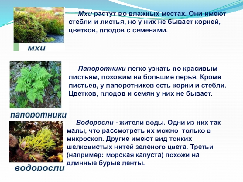 Мхи растут во влажных местах. Они имеют стебли и листья, но у них не бывает корней, цветков, плодов с семенами.