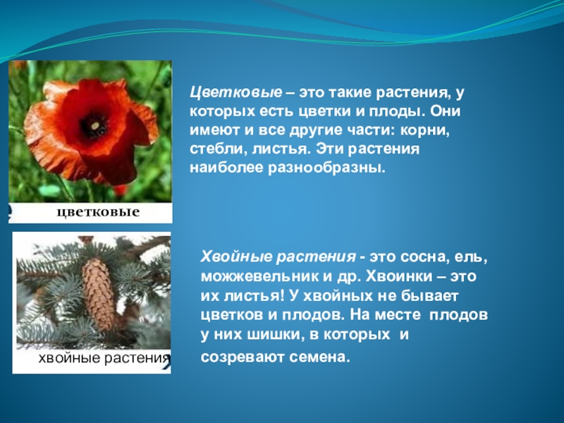 Хвойные растения - это сосна, ель, можжевельник и др. Хвоинки – это их листья! У хвойных не бывает цветков и плодов. На месте плодов у них шишки, в которых и
