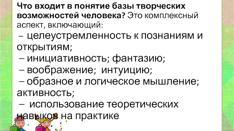 Слайд 2Что входит в понятие базы творческих возможностей человека? Это комплексный аспект,