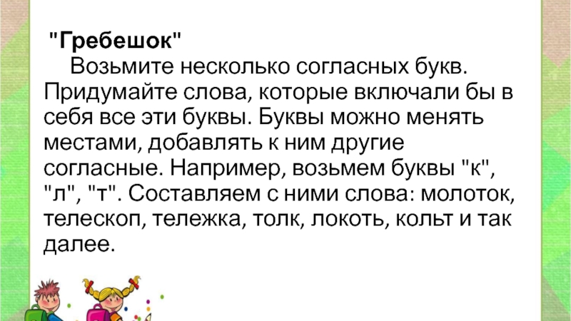 себя все эти буквы. Буквы можно менять местами, добавлять к ним другие согласные. Например, возьмем буквы "к", "л", "т". Составляем с ними слова: молоток, телескоп, тележка, толк, локоть, кольт и так далее.