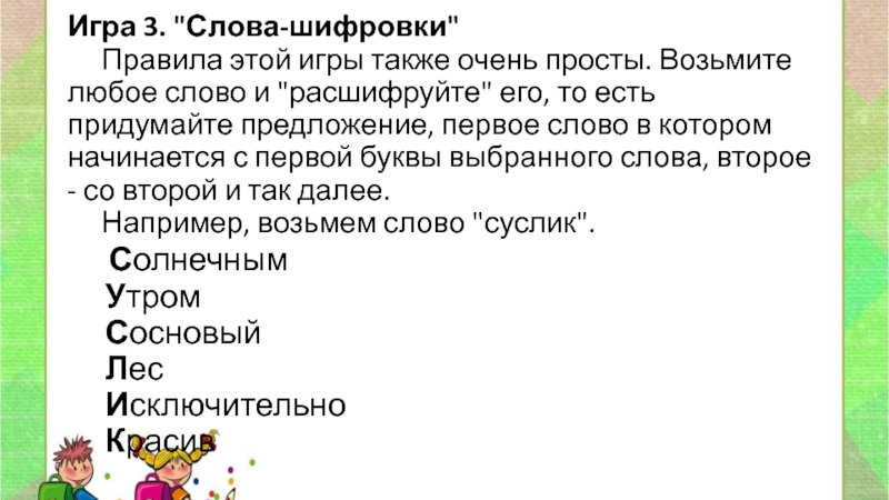 и "расшифруйте" его, то есть придумайте предложение, первое слово в котором начинается с первой буквы выбранного слова, второе - со второй и так далее.