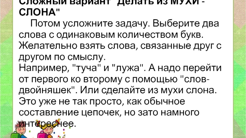 Слайд 7Сложный вариант "Делать из МУХИ - СЛОНА"