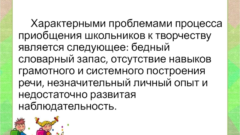 Слайд 4 Характерными проблемами процесса приобщения школьников к творчеству является