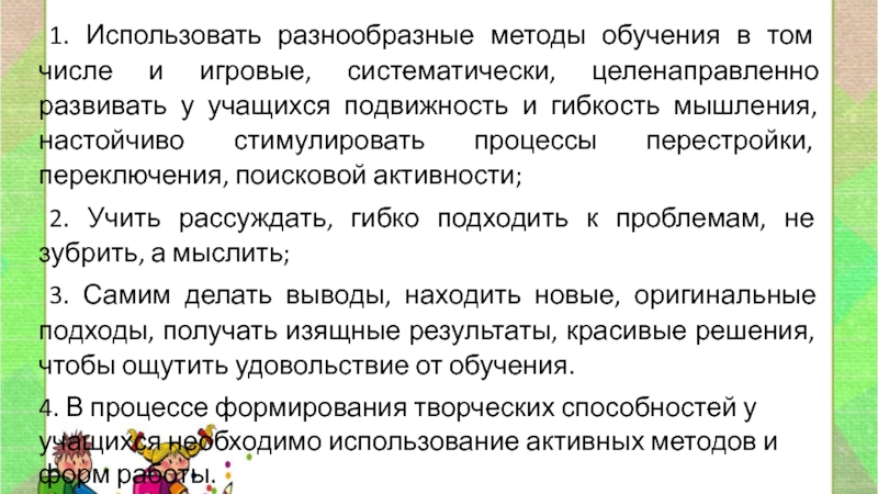 целенаправленно развивать у учащихся подвижность и гибкость мышления, настойчиво стимулировать процессы перестройки, переключения, поисковой активности;