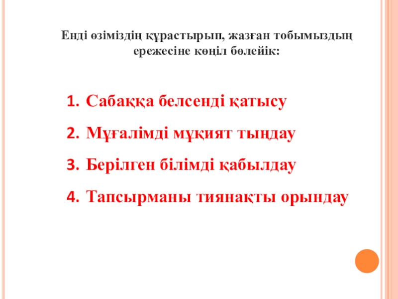 Енді өзіміздің құрастырып, жазған тобымыздың ережесіне көңіл бөлейік: