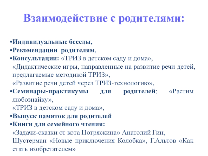 Консультации: «ТРИЗ в детском саду и дома»,