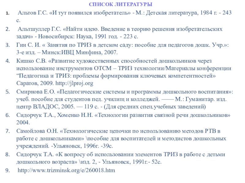 Гин С. И. « Занятия по ТРИЗ в детском саду: пособие для педагогов дошк. Учр.»: 3-е изд. – Минск:ИВЦ Минфина, 2007.