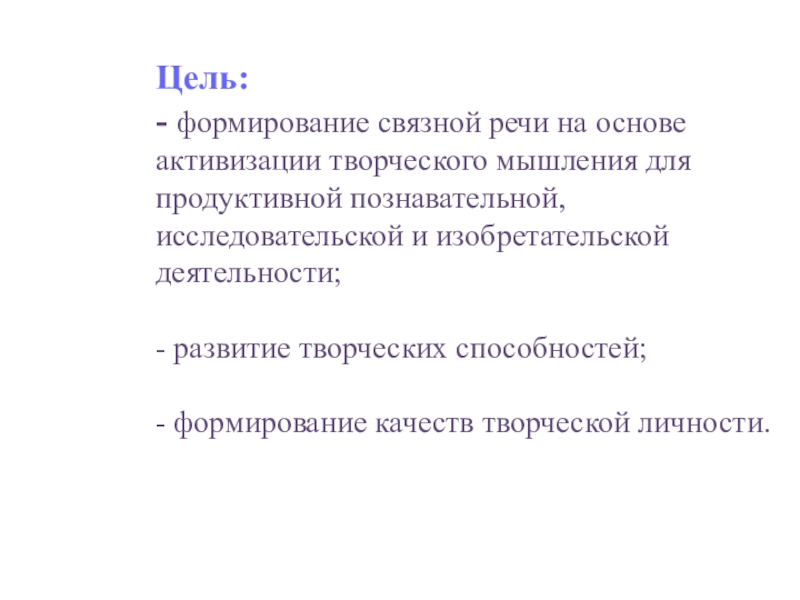 - формирование связной речи на основе активизации творческого мышления для продуктивной