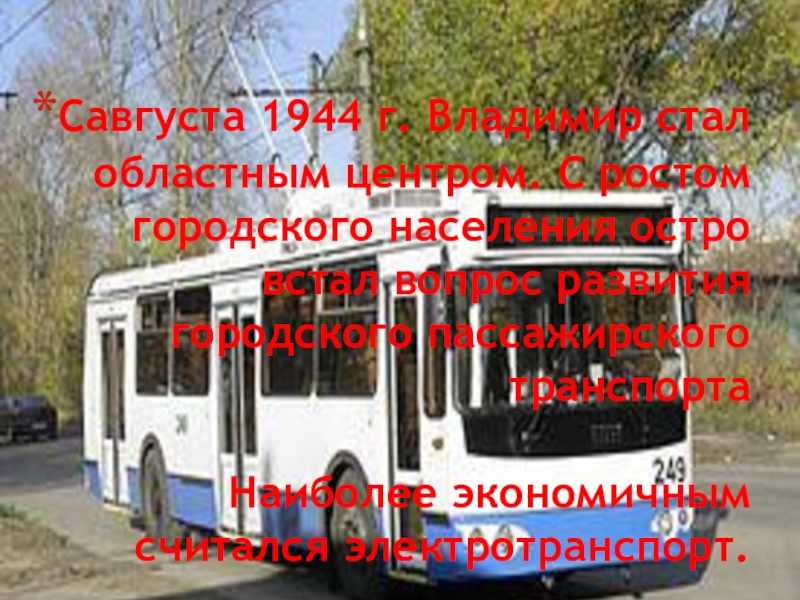 Савгуста 1944 г. Владимир стал областным центром. С ростом городского населения остро встал вопрос развития городского пассажирского транспорта Наиболее экономичным считался электротранспорт.