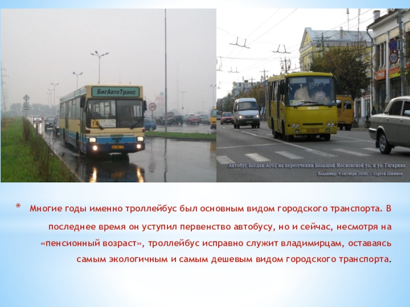 Слайд 8Многие годы именно троллейбус был основным видом городского транспорта. В последнее