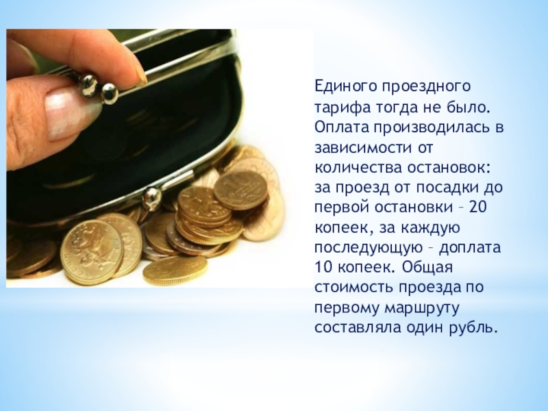 Слайд 6Единого проездного тарифа тогда не было. Оплата производилась в зависимости от