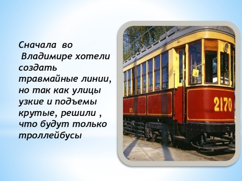 Слайд 3 Сначала во Владимире хотели создать травмайные линии, но так как улицы