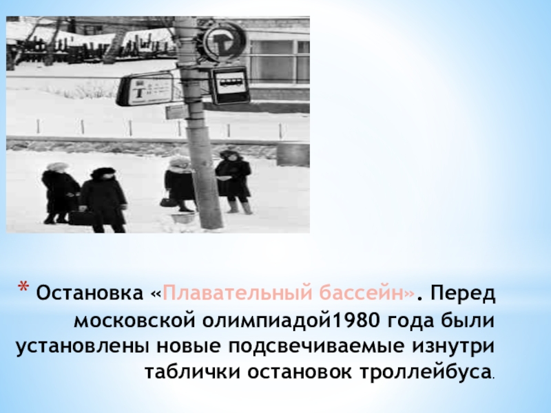 Слайд 7Остановка «Плавательный бассейн». Перед московской олимпиадой1980 года были установлены новые подсвечиваемые