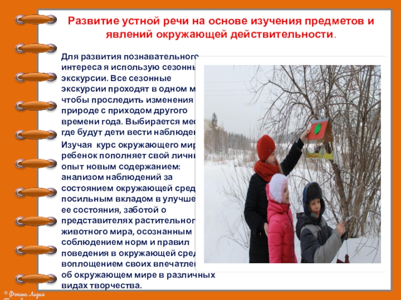 развития познавательного интереса я использую сезонные экскурсии. Все сезонные экскурсии проходят в одном месте, чтобы проследить изменения в природе с приходом другого времени года. Выбирается место, где будут дети вести наблюдение.