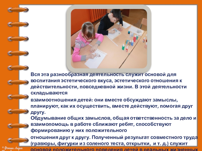 отношения друг к другу. Полученный результат совместного труда (гравюры, фигурки из соленого теста, открытки, и т. д.) служит основой положительного поведения детей в реальных жизненных ситуациях.