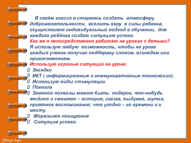 Слайд 6 В своём классе я стараюсь создать атмосферу доброжелательности,