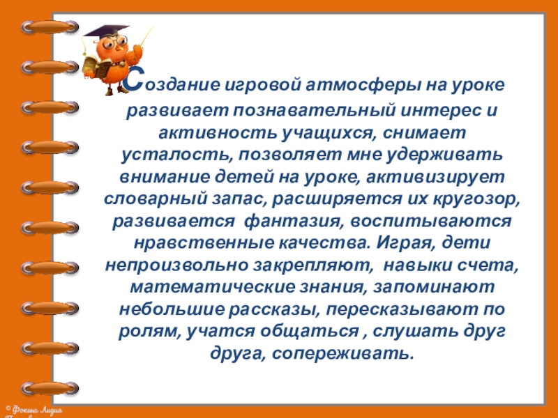 Слайд 8Создание игровой атмосферы на уроке развивает познавательный интерес и активность учащихся,