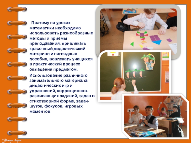 Слайд 11 Поэтому на уроках математики необходимо использовать разнообразные методы и приемы