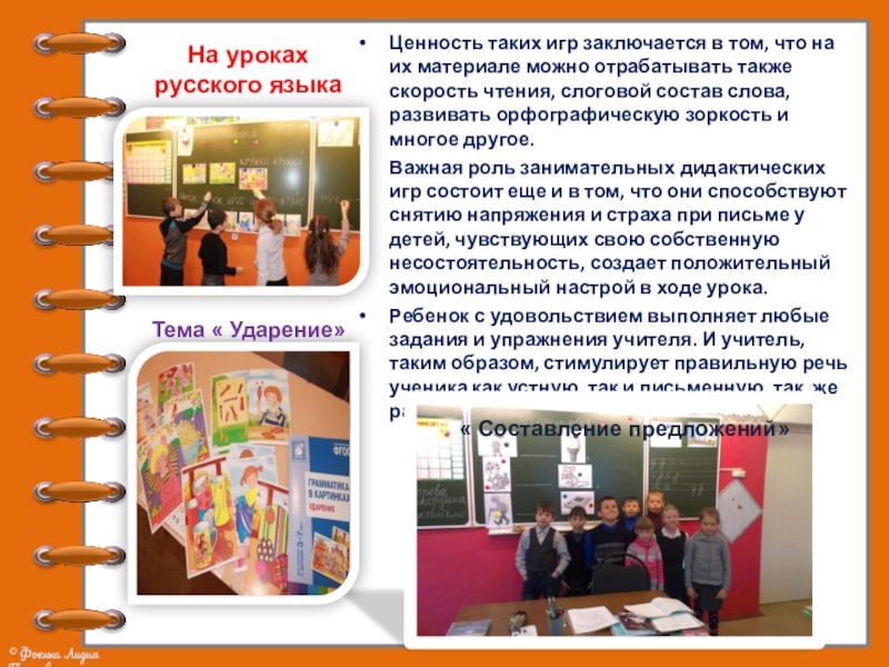 Важная роль занимательных дидактических игр состоит еще и в том, что они способствуют снятию напряжения и страха при письме у детей, чувствующих свою собственную несостоятельность, создает положительный эмоциональный настрой в ходе урока.