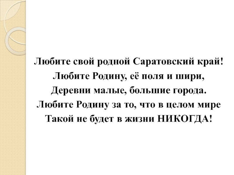 Любите свой родной Саратовский край!Любите Родину, её поля и шири,Деревни малые, большие города.Любите Родину за то, что