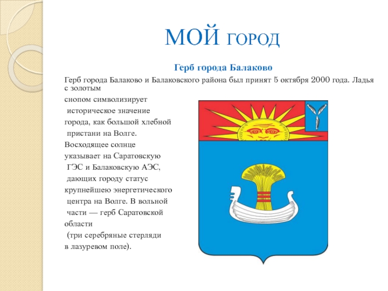 МОЙ город Герб города БалаковоГерб города Балаково и Балаковского района был принят 5 октября 2000 года. Ладья с золотым снопом символизирует историческое значение города, как большой хлебной пристани на Волге. Восходящее солнце указывает на Саратовскую